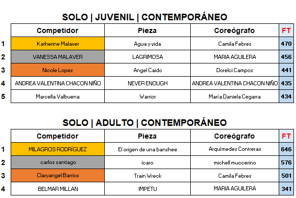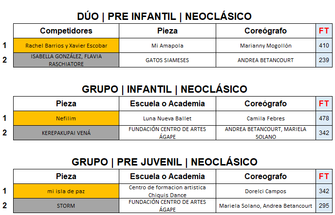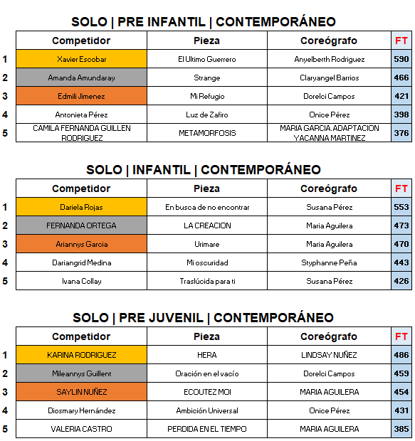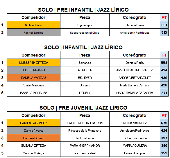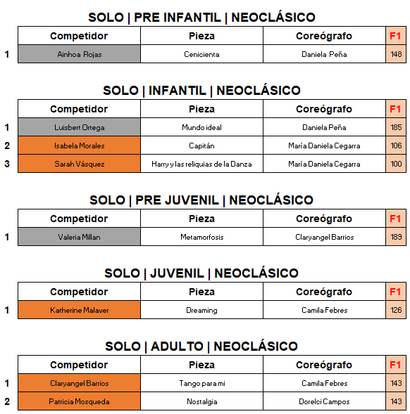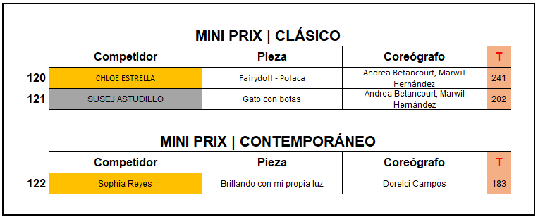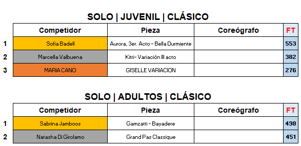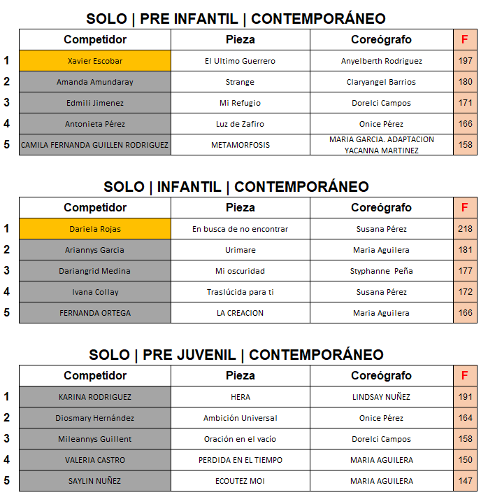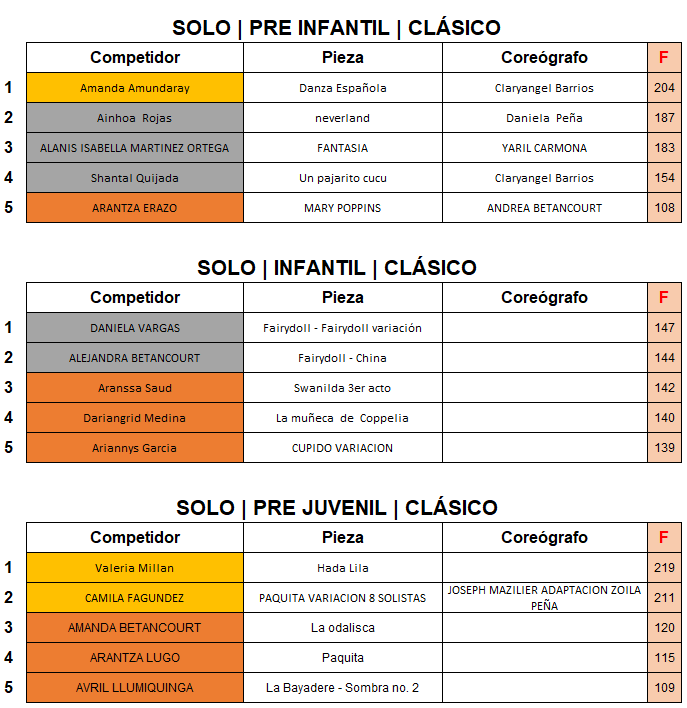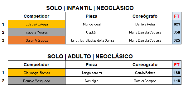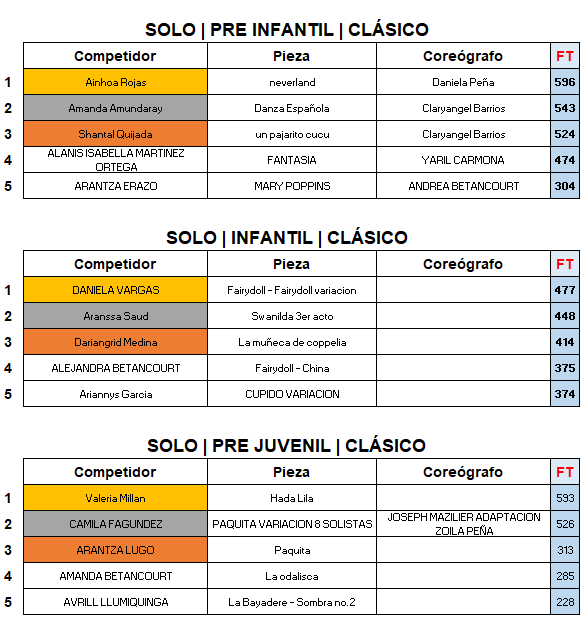 Resultados 2024 Top 5 por Categoría, por División, por Género o Estilo FASE I (Neoclásico - Jazz Lírico) FASE I (Clásico - Contemporáneo) FASE II (Dúos - Grupos) FASE II (Solos) MINI PRIX TOP MEJORES ESCUELAS Premiación General SOYDANZA MARGARITA 2024 Medallas y Trofeos de todos los participantes Aquí