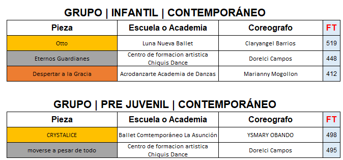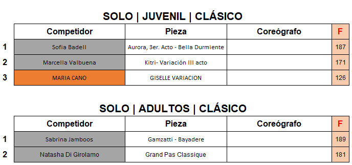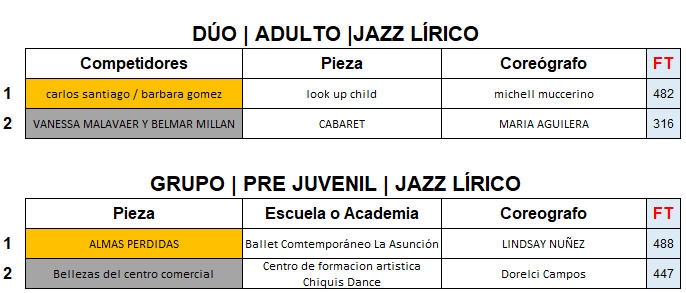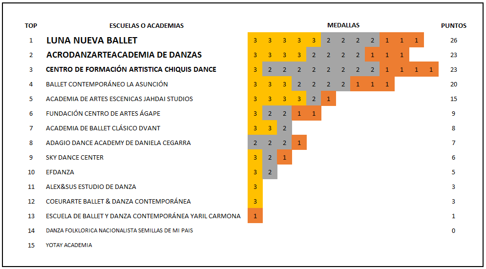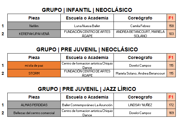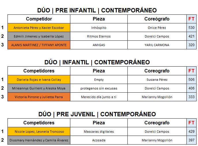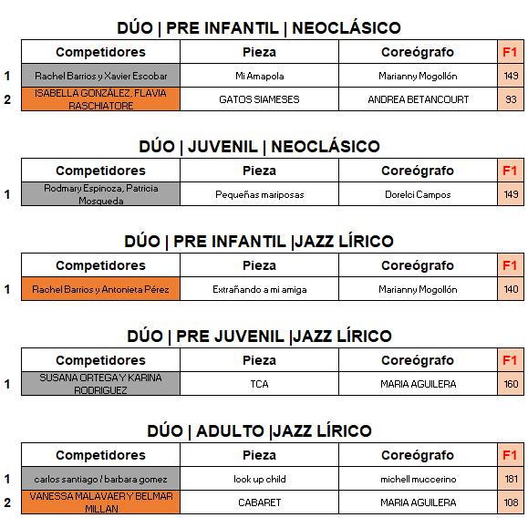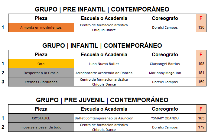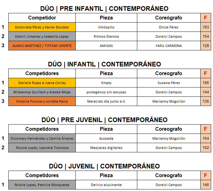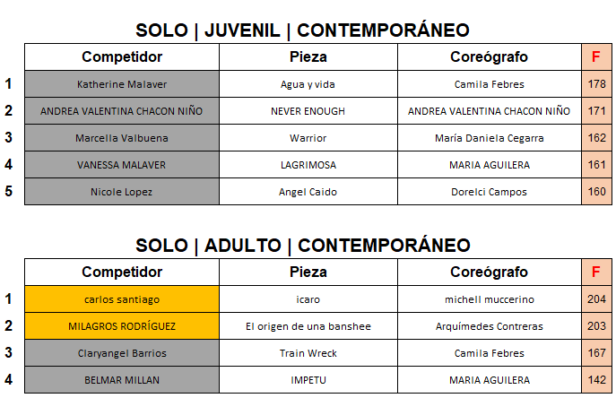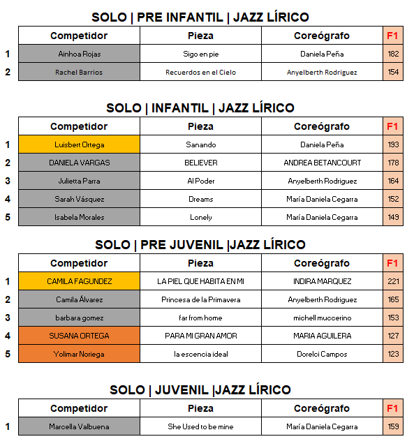 Resultados 2024 Top 5 por Categoría, por División, por Género o Estilo FASE I (Neoclásico - Jazz Lírico) FASE I (Clásico - Contemporáneo) FASE II (Dúos - Grupos) FASE II (Solos) MINI PRIX TOP MEJORES ESCUELAS Premiación General SOYDANZA MARGARITA 2024 Medallas y Trofeos de todos los participantes Aquí